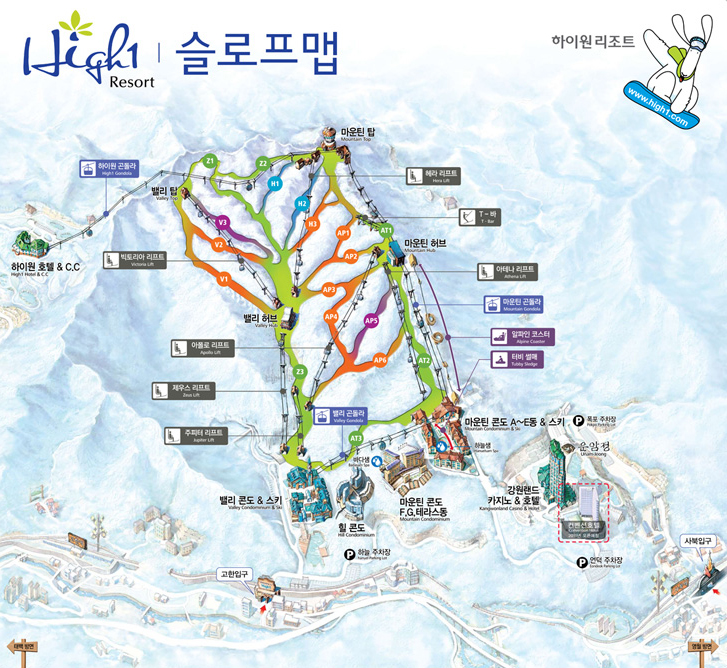 백운산 1,367M로부터 표고차 약 680M까지의 천혜의 환경 안에서 18면, 총 연장 약 21KM의 프리미엄을 온 몸으로 즐기실 수 있는 환상적인 슬로프입니다. HIGH1 SLOPE MAP을 통해 약 28만평에 달하는 하이원 스키장의 프리미엄 슬로프를 미리 체험하세요.